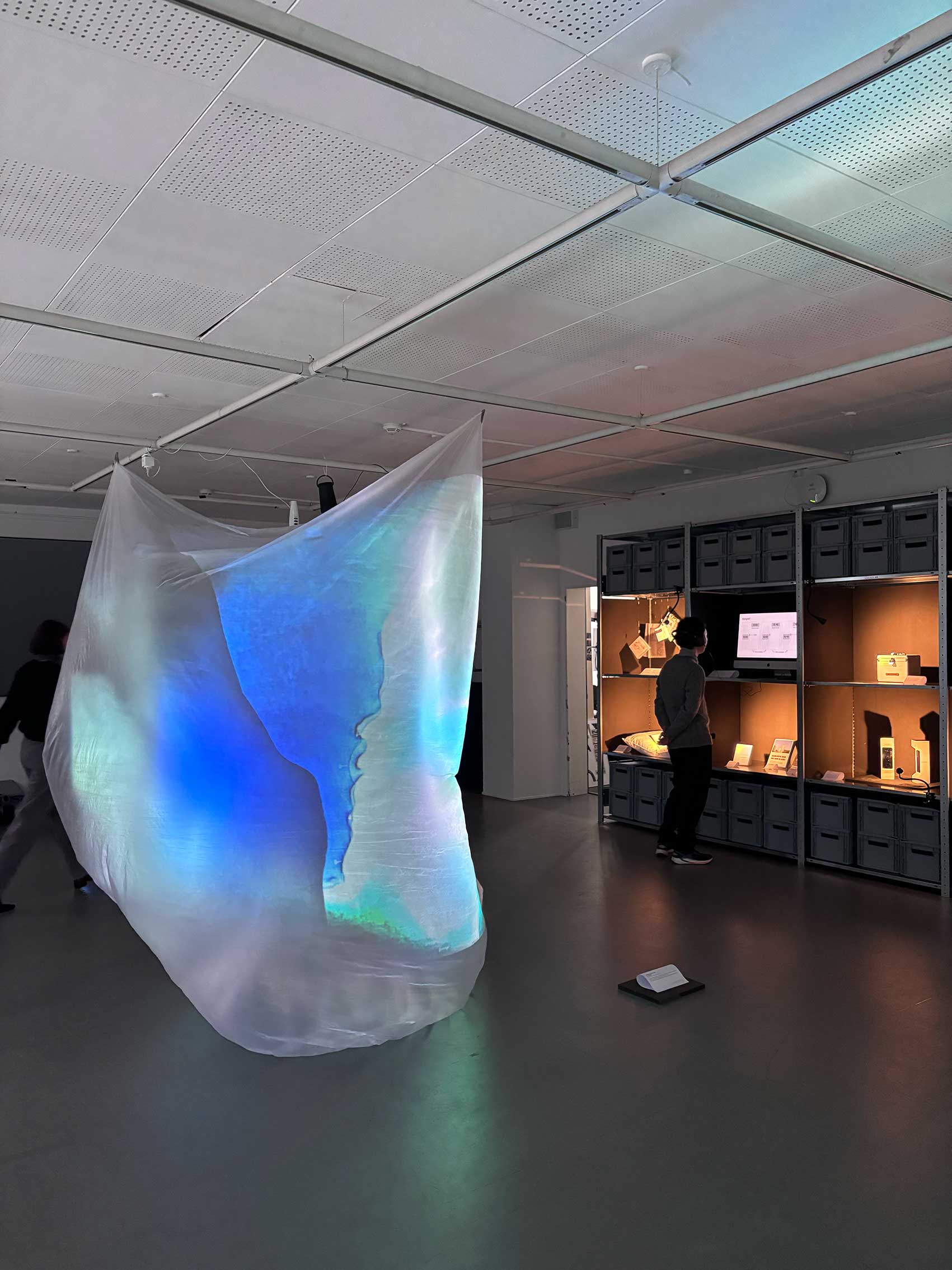 Ein zentrales Exponat bildet die interaktive Installation „Intelligence in the Fog“ von Konrad Kebbel. Die Arbeit reflektiert unser Verhältnis zur Künstlichen Intelligenz und stellt die Frage, ob wir technischen Systemen mehr Intelligenz zuschreiben, als sie tatsächlich besitzen. Das scheinbare Gegenüber bleibt undurchsichtig; sein Innenleben entzieht sich der Zuschreibung. Gerade diese Unbestimmtheit macht die Projektionen sichtbar, mit denen wir KI aufladen.