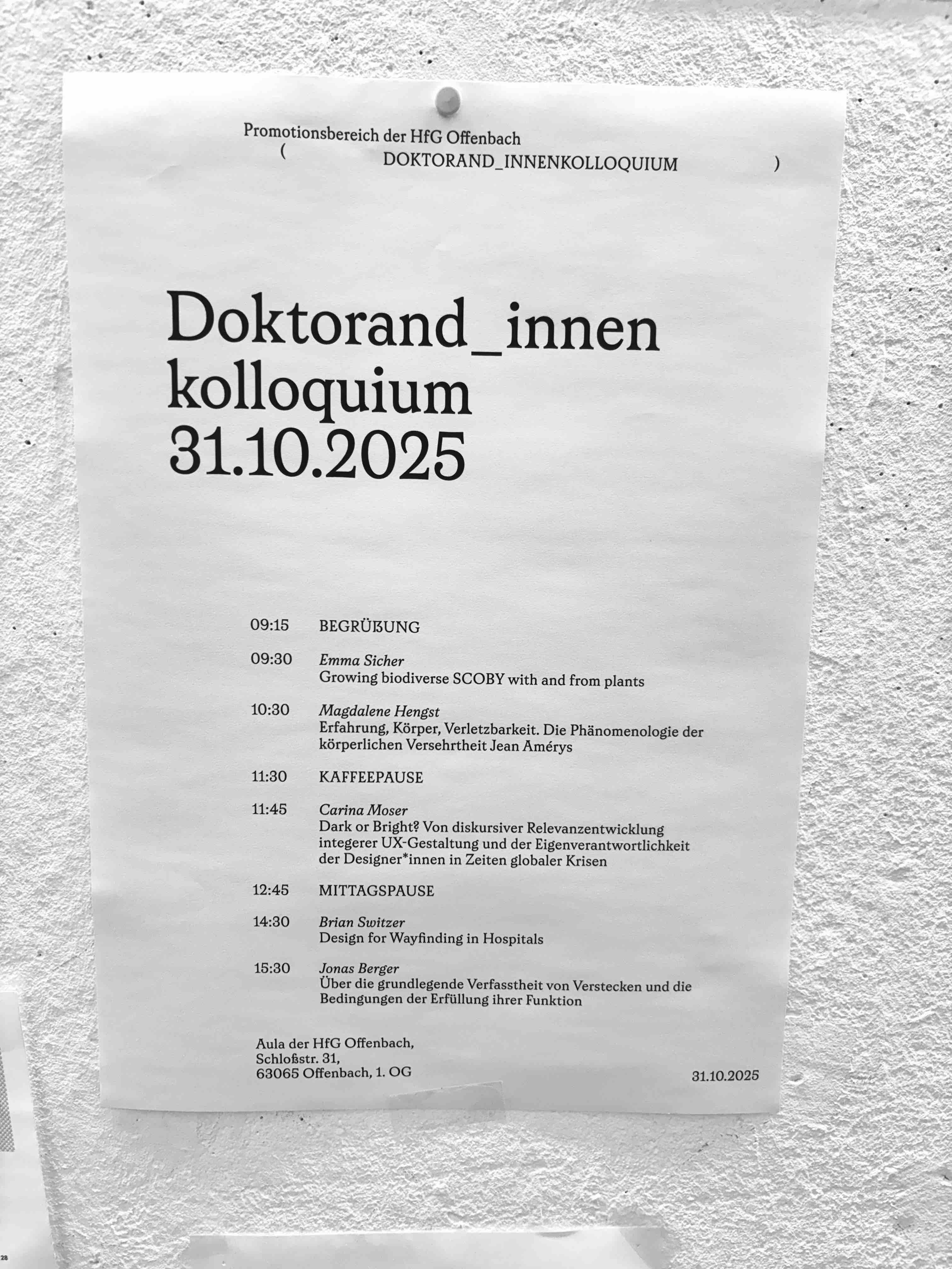 On October 31, 2025, the Doctoral Program of the HfG Offenbach University of Art and Design hosted its annual Doctoral Colloquium in the university’s Aula. From morning until late afternoon, five doctoral researchers presented their ongoing work at the intersection of design, art, and theory, offering rich insight into the transdisciplinary research culture that defines HfG Offenbach. The event, moderated by Tom Bieling, exemplified the university’s unique approach to doctoral studies, where artistic practice and theoretical reflection are deeply intertwined. Doctoral research at HfG typically combines two-thirds written academic work with one-third artistic or design-based practice, conceived not as separate parts but as complementary modes of inquiry. Each doctoral candidate is supervised by professors from both theoretical and artistic disciplines, underscoring the institution’s commitment to fostering a research environment that unites reflection, experimentation, and social engagement.
