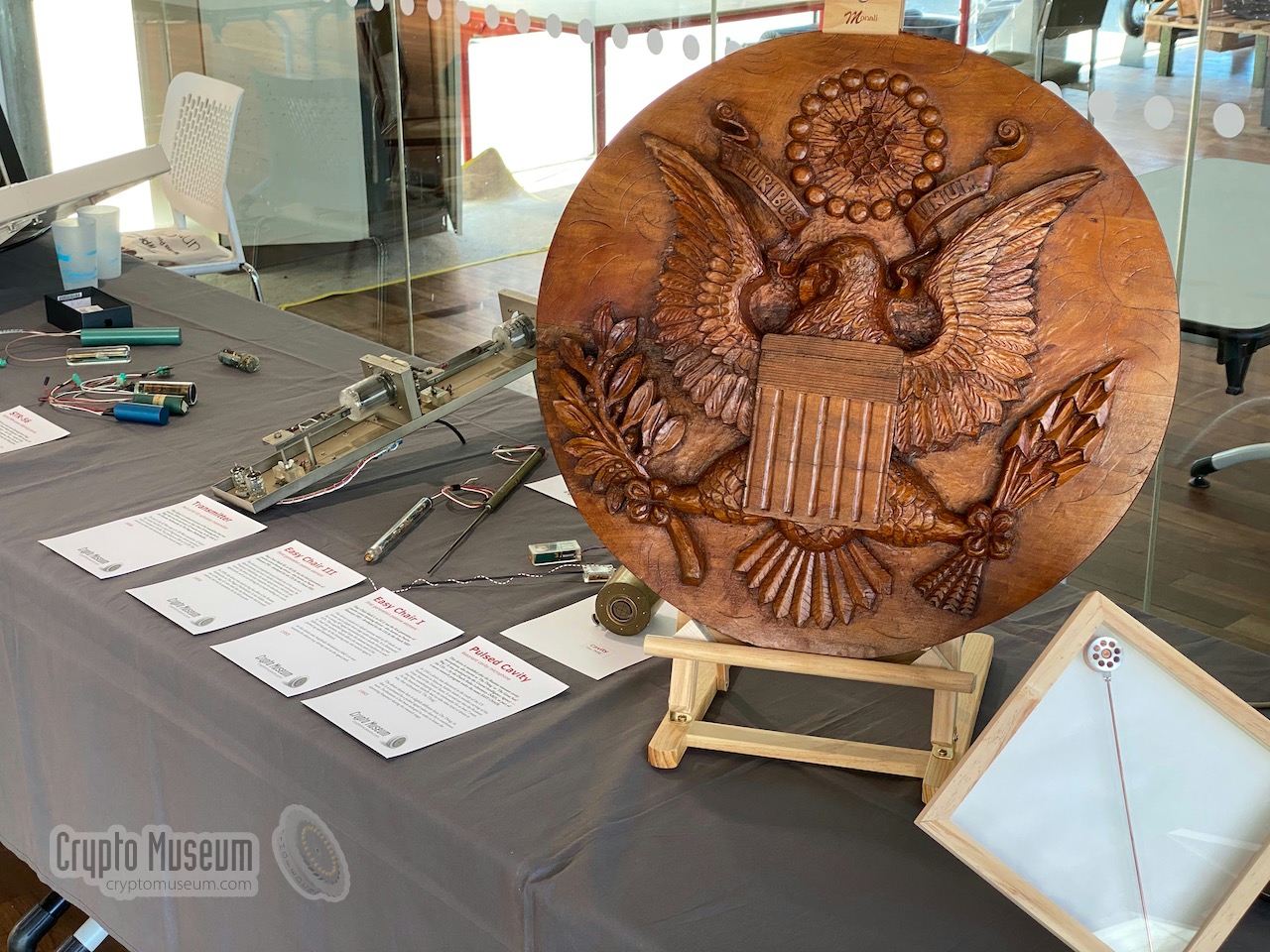 Finally, Jonas Berger‘s presentation explored the communicative and functional logic of hiding. His dissertation examines how physical hiding-objects convey their inconspicuousness and fulfill their concealing function. The concept of “Hide-Semantics” he develops analyzes the perceptual and material conditions that make an object a successful hiding place. Berger studies techniques of perception management and expectation control, focusing on the notion of object plausibility — how an object’s material, weight, and form align with everyday expectations to remain unnoticed. He connects these insights to the language of product design, revealing how communicative features of hiding objects overlap with general design strategies that balance visibility and discretion. His project also considers the social and symbolic functions of hiding, offering a nuanced understanding of how design participates in systems of perception, secrecy, and interaction. Berger paid particular attention to The Thing, the ingenious Soviet listening device concealed within a wooden Great Seal of the United States. By examining Léon Theremin’s design (Yes, Theremin, the inventor of the instrument of the same name), Berger highlights how functional invisibility and communicative plausibility intersect — how an object can be both materially present and perceptually absent. The Thing thus serves as a paradigmatic case in his study of how concealment operates through design, perception, and meaning.