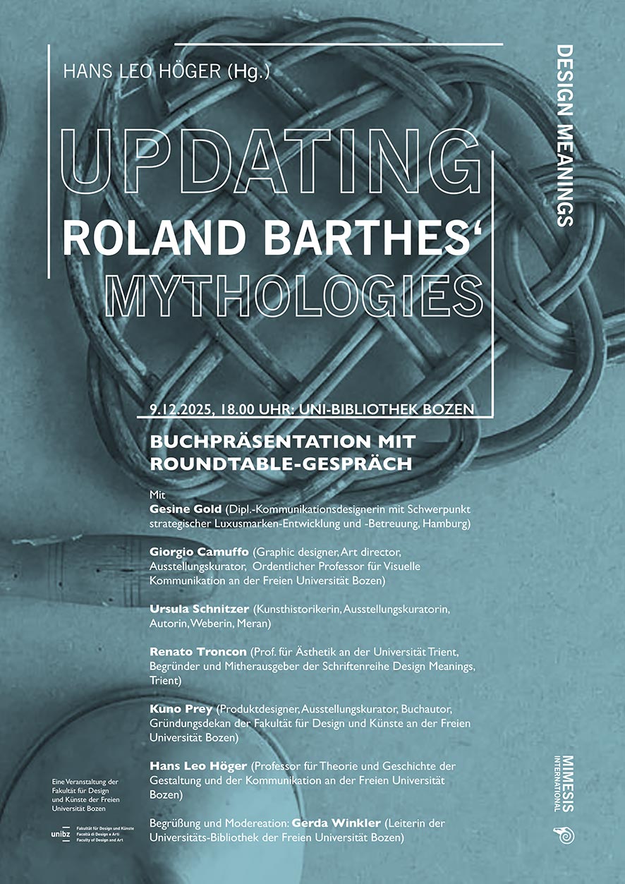 Am 9. Dezember (18 Uhr) wird das Buch in der Universitätsbibliothek am unibz Campus Bozen Zentrum vorgestellt. Im Anschluss findet ein Runder Tisch statt. Mit dabei: Gesine Gold (Dipl.-Kommunikationsdesignerin mit Schwerpunkt strategischer Luxusmarken-Entwicklung und -Betreuung, Hamburg), Ursula Schnitzer (Kunsthistorikerin, Ausstellungskuratorin, Autorin, Weberin, Meran), Renato Troncon (Professor für Ästhetik an der Universität Trient, Begründer und Mitherausgeber der wissenschaftlichen Buchreihe “Design Meanings”), Kuno Prey (Produktdesigner, Ausstellungskurator, Buchautor, Gründungsdekan der Fakultät für Design und Künste an der Freien Universität Bozen) sowie Hans Leo Höger (Herausgeber des Buches).